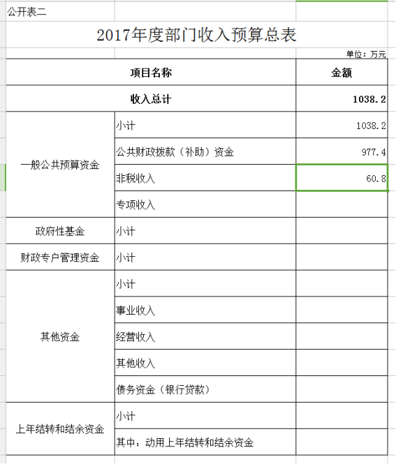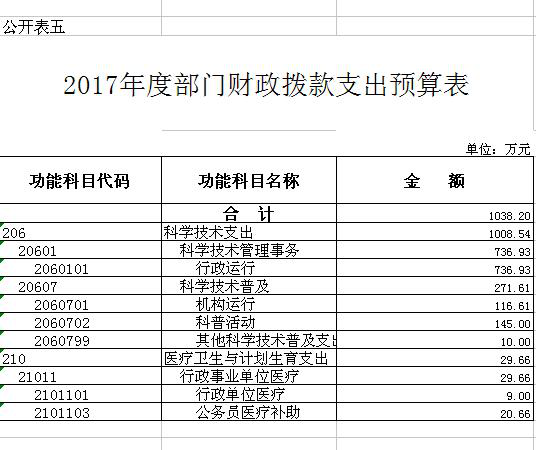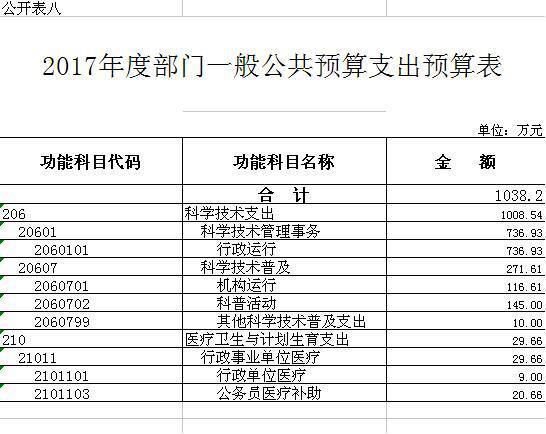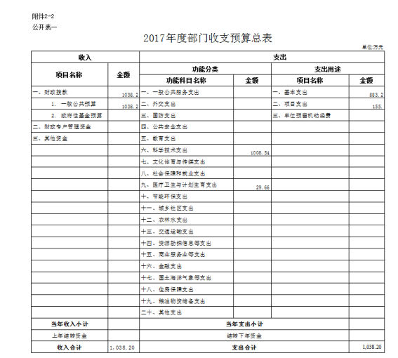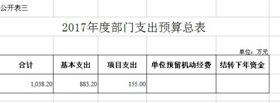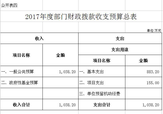 本部門2017年度財政撥款收、支總預算 1038.2 萬元。與上年相比,財政撥款收、支總計各增加 117.47 萬元,增長 12.7 %。主要原因是調資后工資福利增加及提租補貼提高。