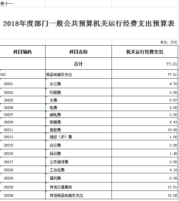 2018年本部門一般公共預(yù)算機(jī)關(guān)運(yùn)行經(jīng)費(fèi)預(yù)算支出 77.01 萬元,與上年相比減少 53.51  萬元,降低 41   %。主要原因是:今年對(duì)自收自支事業(yè)單位經(jīng)費(fèi)從此項(xiàng)剔除