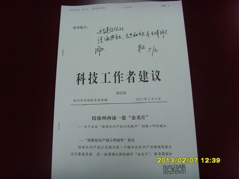 2月5日,徐州市市長朱民對科協(xié)上報的第四期《給徐州再添一張“金名片” —— 關(guān)于啟動“國家知識產(chǎn)權(quán)示范城市”創(chuàng)建工作的建議》(《科技工作者建議》)作出重要批示:“這個建議很好,請海燕市長、志杰秘書長并王琦同志閱處?!?/P>