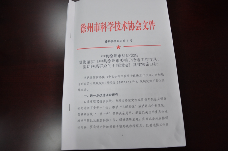近日,徐州市科協(xié)黨組召開專題會議,認(rèn)真學(xué)習(xí)貫徹中央、江蘇省委和徐州市委有關(guān)會議、文件精神,緊密結(jié)合徐州市科協(xié)工作實際,研究制定了《中共徐州市科協(xié)黨組貫徹落實〈中共徐州市委關(guān)于改進工作作風(fēng)、密切聯(lián)系群眾的十項規(guī)定〉具體實施辦法》“(以下簡稱《辦法》)。