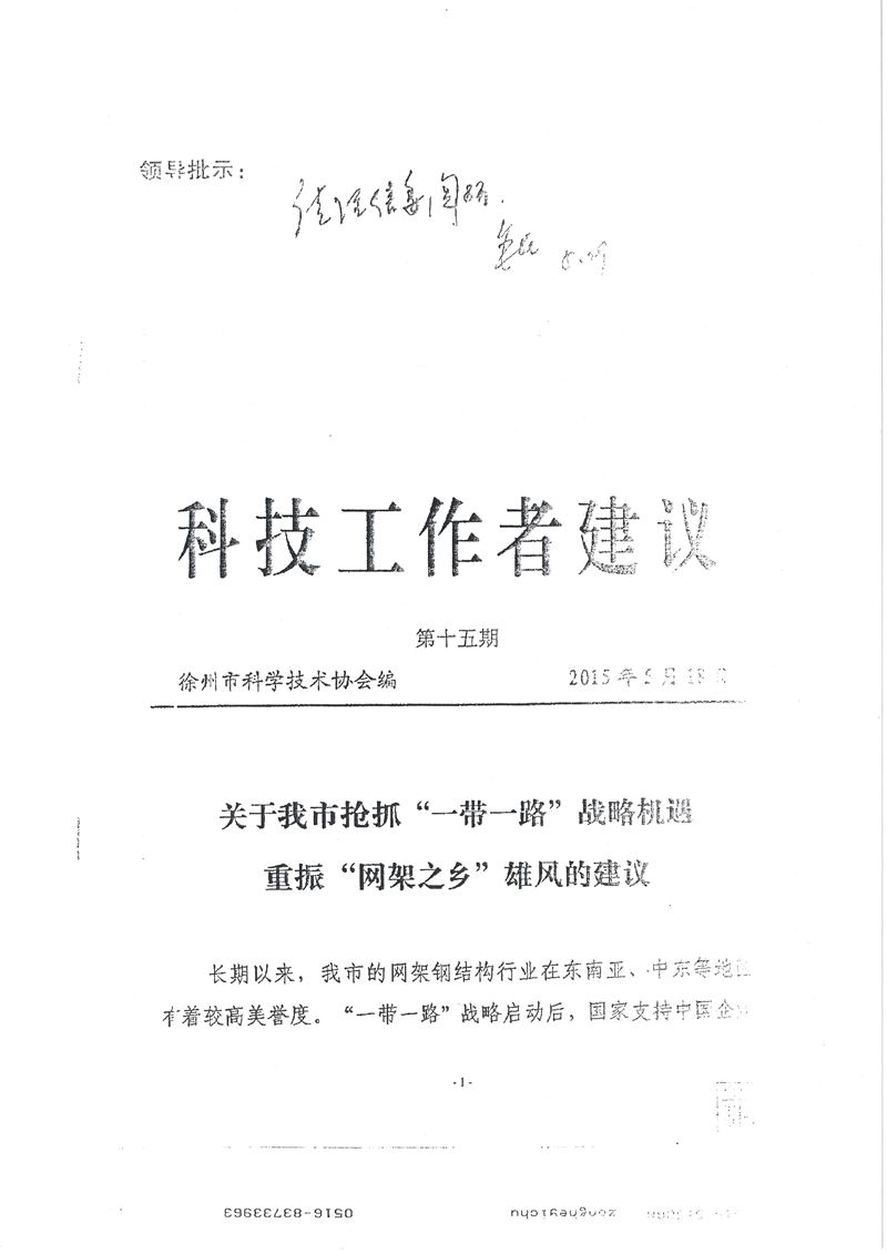 長(zhǎng)期以來,徐州市網(wǎng)架鋼結(jié)構(gòu)行業(yè)在東南亞、中東等地區(qū)有著較高美譽(yù)度。“一帶一路”戰(zhàn)略啟動(dòng)后,國(guó)家支持中國(guó)企業(yè)為上諸地區(qū)建設(shè)基礎(chǔ)設(shè)施項(xiàng)目,給網(wǎng)架鋼結(jié)構(gòu)企業(yè)大發(fā)展帶來了前所未有的難得機(jī)遇。為此,市科協(xié)組織相關(guān)專家,針對(duì)目前徐州市網(wǎng)架鋼結(jié)構(gòu)企業(yè)規(guī)模偏小,競(jìng)爭(zhēng)力較弱,政府產(chǎn)業(yè)扶持力度不足的現(xiàn)狀,就如何搶抓戰(zhàn)略機(jī)遇、發(fā)揮產(chǎn)業(yè)優(yōu)勢(shì)、加快“走出去”步伐進(jìn)行了調(diào)研并提出建議。 《建議》從加大政策扶持力度、做大做強(qiáng)龍頭企業(yè)集團(tuán)、高水平打造自主研發(fā)平臺(tái)、大力推廣網(wǎng)架鋼結(jié)構(gòu)與光伏發(fā)電系統(tǒng)的有機(jī)結(jié)合等四個(gè)方面,向市委、市政府提出了比較詳細(xì)的、可操作性較強(qiáng)的建議,為市領(lǐng)導(dǎo)科學(xué)決策獻(xiàn)計(jì)獻(xiàn)策。
