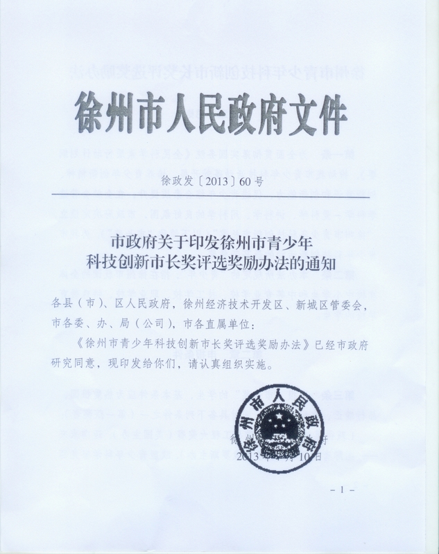 由徐州市第二期科技工作者建議提出的:并于設(shè)立徐州市青少年科技創(chuàng)新市長獎的建議得到市政府同意,市政府7月10日印發(fā)了《市政府關(guān)于印發(fā)徐州市青少年科技創(chuàng)新市長獎評選獎勵辦法的通知》(徐政發(fā)〔2013〕60號)。市政府決定設(shè)立“徐州市青少年科技創(chuàng)新市長獎”,作為全市青少年科技創(chuàng)新活動的最高榮譽獎。