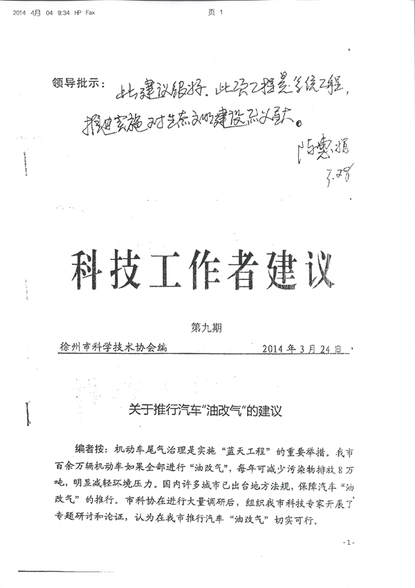 3月28日,江蘇省科協(xié)黨組書記陳惠娟對(duì)市科協(xié)第九期《科技工作者建議》“關(guān)于推行汽車‘油改氣’的建議”作出重要批示:“此建議很好。此項(xiàng)工程是系統(tǒng)工程,推進(jìn)實(shí)施對(duì)生態(tài)文明建設(shè)意義重大?!?/P>