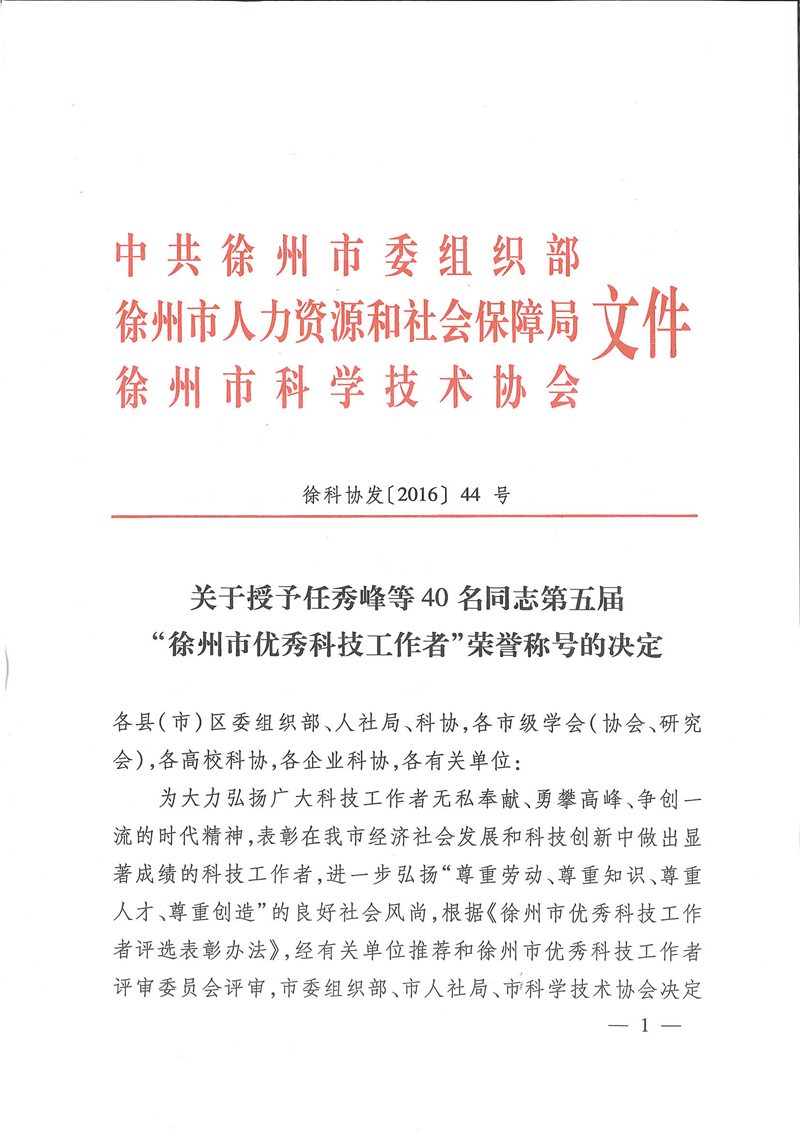 5月18日,徐州市委組織部、徐州市人社局、徐州市科協(xié)聯(lián)合發(fā)文對(duì)第五屆“徐州市優(yōu)秀科技工作者”進(jìn)行表彰。共有來自理工、農(nóng)業(yè)、醫(yī)藥、綜合四大類的40名同志榮獲第五屆“徐州市優(yōu)秀科技工作者”榮譽(yù)稱號(hào)。