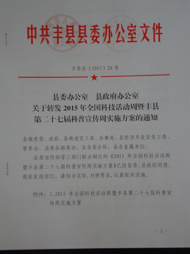 為貫徹落實(shí)黨的十八屆三中、四中全會(huì)精神和習(xí)近平總書記系列重要講話精神,豐縣縣委宣傳部、縣科技局、縣科協(xié)聯(lián)合制定了《2015年全國(guó)科技活動(dòng)周暨豐縣第二十七屆科普宣傳周實(shí)施方案》報(bào)縣委、縣政府。經(jīng)縣委、縣政府同意,以豐委辦[2015]26號(hào)文件進(jìn)行了轉(zhuǎn)發(fā),文件的轉(zhuǎn)發(fā),充分體現(xiàn)了縣委、縣政府對(duì)科普工作的重視。