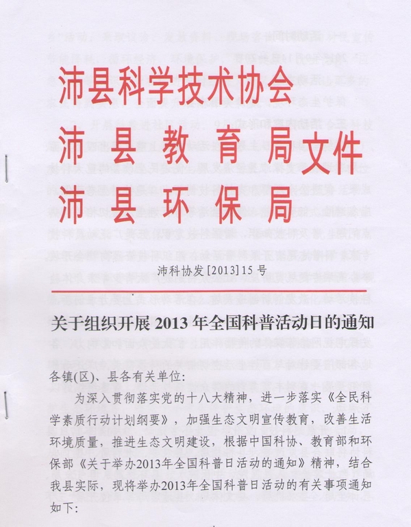 為擴(kuò)大全國科普日活動在沛縣影響力和覆蓋面,深入貫徹落實黨的十八大精神,進(jìn)一步落實《全民科學(xué)素質(zhì)行動計劃綱要》,圍繞2013年全國科普日主題,立足沛縣發(fā)展實情,沛縣科協(xié)聯(lián)合沛縣教育局、沛縣環(huán)保局于9月3日印發(fā)《關(guān)于組織開展2013年全國科普活動日的通知》,下發(fā)到各鎮(zhèn)、縣直各有關(guān)單位。