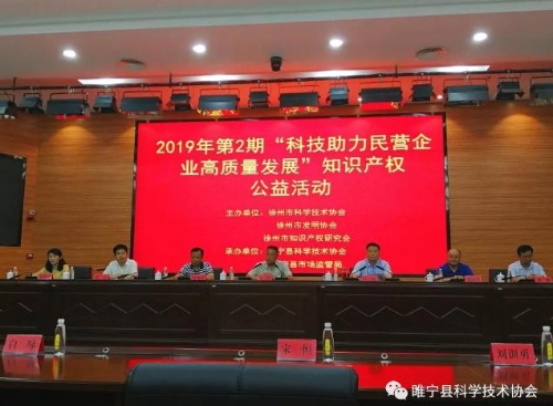 為落實省科協(xié)關于助力民營企業(yè)高質量發(fā)展和市科協(xié)《關于開展科技助力民營企業(yè)高質量發(fā)展系列活動的通知》精神,2019年7月17日下午,徐州市科學技術協(xié)會副主席宋恒、學會部部長劉訓勇;徐州市發(fā)明協(xié)會常務副會長、江蘇華商企業(yè)管理咨詢服務有限公司總經(jīng)理孟慶才博士來睢開展“科技助力民營企業(yè)高質量發(fā)展”知識產(chǎn)權公益活動。此次活動由睢寧縣科協(xié)與睢寧縣市場監(jiān)督管理局聯(lián)合承辦,在睢寧縣商務中心三樓會議室舉行。