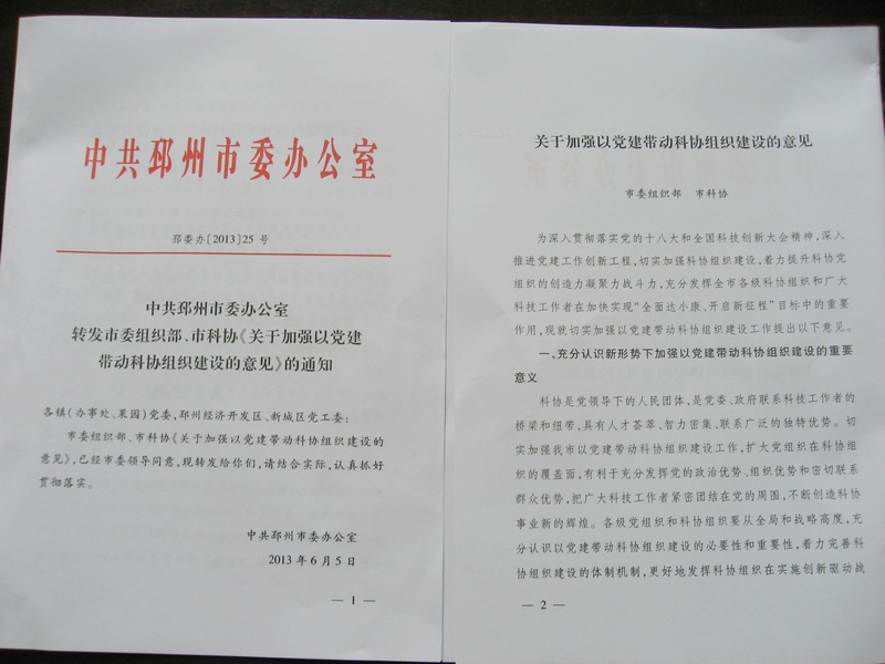 為貫徹落實黨的十八大精神,深入推進黨建工作創(chuàng)新工程,切實加強科協(xié)組織建設(shè),著力提升科協(xié)黨組織的創(chuàng)造力、凝聚力和戰(zhàn)斗力,充分發(fā)揮全市各級科協(xié)組織和廣大科技工作者在加快實現(xiàn)“全面達小康、開啟新征程”目標中的重要作用。邳州市委組織部、市科協(xié)聯(lián)合制定了《關(guān)于加強以黨建帶動科協(xié)組織建設(shè)的意見》,經(jīng)市委主要領(lǐng)導同意,由邳州市委辦公室轉(zhuǎn)發(fā)到各有關(guān)部門,并認真抓好落實。