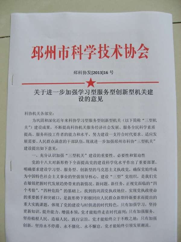 為鞏固和深化科協(xié)學(xué)習(xí)型服務(wù)型創(chuàng)新型機(jī)關(guān)(以下簡(jiǎn)稱“三型機(jī)關(guān)”)建設(shè)成果,不斷提高科協(xié)機(jī)關(guān)服務(wù)經(jīng)濟(jì)社會(huì)發(fā)展、服務(wù)全民科學(xué)素質(zhì)提高、服務(wù)科技工作者的能力和水平,建設(shè)一支符合時(shí)代要求、適應(yīng)發(fā)展需要、人民群眾滿意的干部隊(duì)伍,邳州市科協(xié)印發(fā)了《關(guān)于進(jìn)一步加強(qiáng)學(xué)習(xí)型服務(wù)型創(chuàng)新型機(jī)關(guān)建設(shè)的意見》。