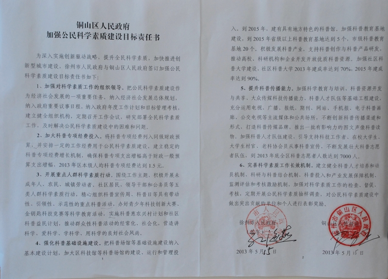 為深入貫徹落實(shí)《銅山區(qū)2011—2015年全民科學(xué)素質(zhì)行動計(jì)劃綱要實(shí)施方案》,進(jìn)一步提升全區(qū)公民科學(xué)素質(zhì),日前,銅山區(qū)人民政府與徐州市人民政府簽訂了加強(qiáng)公民科學(xué)素質(zhì)建設(shè)目標(biāo)責(zé)任書。