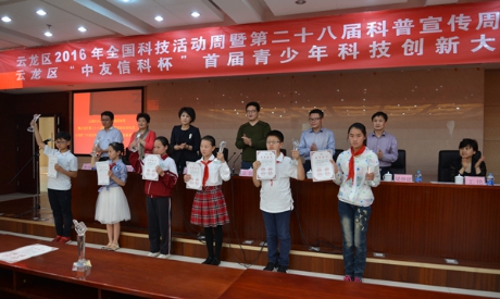 5月12日下午,云龍區(qū)召開(kāi)2016年全國(guó)科技活動(dòng)周暨第二十八屆科普宣傳周活動(dòng)啟動(dòng)儀式和“中友信科杯”首屆青少年科技創(chuàng)新大賽表彰大會(huì)。區(qū)委常委、組織部長(zhǎng)陳銳;副區(qū)長(zhǎng)康寧;副區(qū)長(zhǎng)、科技鎮(zhèn)長(zhǎng)團(tuán)團(tuán)長(zhǎng)宋思運(yùn);江蘇中友訊華科技有限公司董事長(zhǎng)梁繼建;區(qū)科協(xié)(科技局)、教體局、團(tuán)區(qū)委負(fù)責(zé)人;區(qū)全民科學(xué)素質(zhì)工作領(lǐng)導(dǎo)小組分管負(fù)責(zé)人、各街道辦事處分管負(fù)責(zé)人;區(qū)中小學(xué)校長(zhǎng)、獲獎(jiǎng)學(xué)生、科技輔導(dǎo)員和學(xué)生家長(zhǎng)等80余人參加會(huì)議。