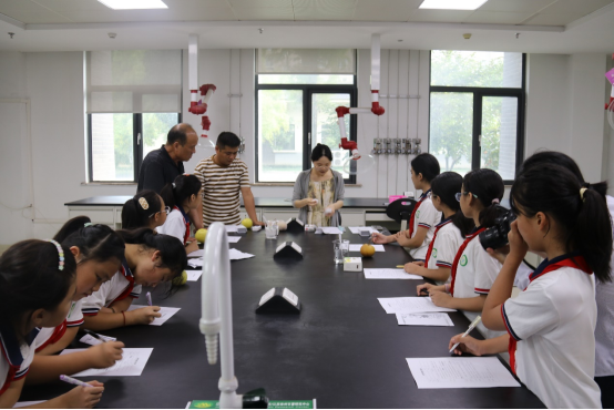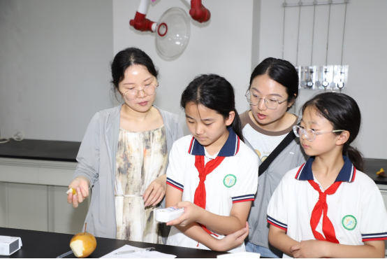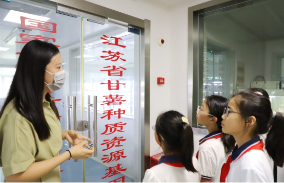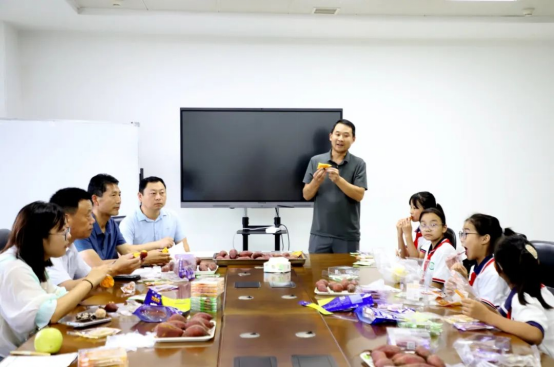 在實(shí)驗(yàn)室,面對(duì)保存著1800余份甘薯種質(zhì)資源的國家甘薯種質(zhì)資源試管苗庫,參加活動(dòng)的小學(xué)生們驚嘆不已,他們深切感受到了農(nóng)作物種質(zhì)資源的多樣性和農(nóng)業(yè)科技的魅力。在甘薯加工利用實(shí)驗(yàn)室,大家圍坐一起,品嘗著由甘薯制作而成的各式美食—香脆可口的甘薯薄餅、軟糯甘甜的紅薯干以及熱氣騰騰的現(xiàn)蒸紅薯,農(nóng)學(xué)會(huì)專家、科技人員后猛和岳瑞雪分別講解了不同品種甘薯的口感差異、顏色差異、豐富多樣的加工產(chǎn)品及其科學(xué)原理。大家一邊品嘗著甘薯加工產(chǎn)品,一邊交流著對(duì)農(nóng)業(yè)科技產(chǎn)品的感受,在享受美味的同時(shí),也收獲了滿滿的科普知識(shí)。然后,在實(shí)驗(yàn)室工作人員侯會(huì)的指導(dǎo)下,孩子們利用專業(yè)的儀器測(cè)量自己從家中帶來的皇冠梨的甜度,更加直觀地了解自家梨子的品質(zhì)。這一過程,不僅讓他們學(xué)會(huì)了如何使用科學(xué)儀器進(jìn)行簡(jiǎn)單的實(shí)驗(yàn)操作,更深刻體會(huì)到了科學(xué)探究的樂趣。