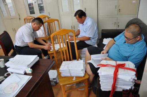 工作人員正在逐一清點回收的答題卡
